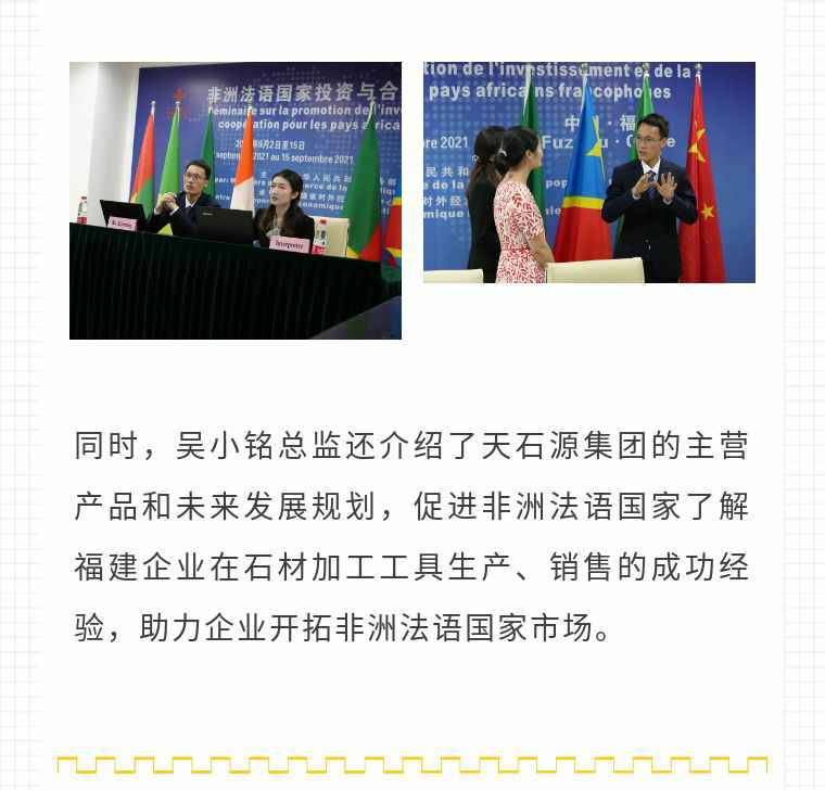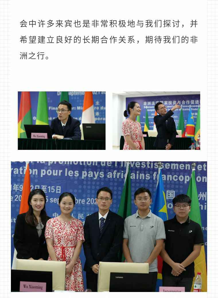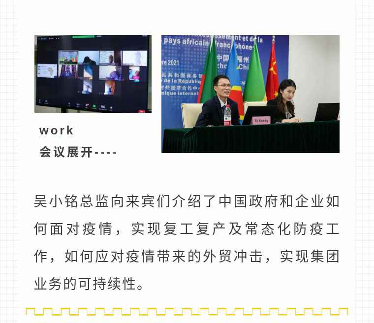 2021年9月6日,B体育网页版登录入口-B体育(中国)应福建省对外经济合作中心邀请,由非洲大区市场总监吴小铭作为代表与包括25位来自非洲法语国家经贸、投资促进政府部门官员及企业管理人员就疫情下中国企业如何应对机遇与挑战展开讨论。